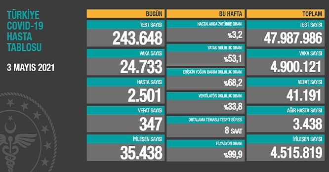 Sağlık Bakanlığı tarafından 3 Mayıs 2021 tarihli, Türkiye Günlük Koronavirüs Covid_19 Tablosu paylaşıldı.