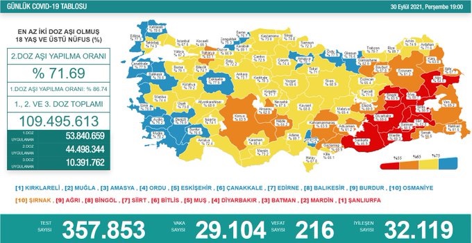 Sağlık Bakanlığı tarafından 30 Eylül 2021 tarihli, Türkiye Günlük Koronavirüs Covid-19 Tablosunun son hali paylaşıldı.