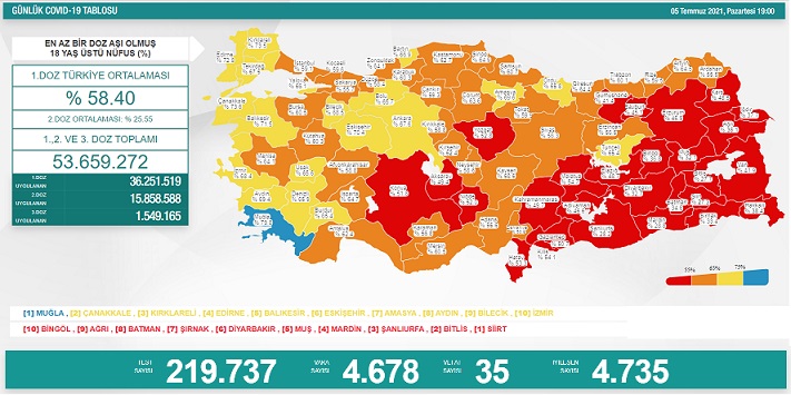 Sağlık Bakanı tarafından 5 Temmuz 2021 tarihli, Türkiye Günlük Koronavirüs Covid_19 Tablosunun son hali paylaşıldı.