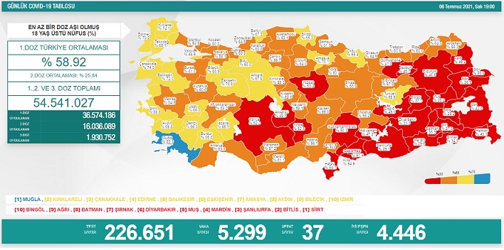 Sağlık Bakanı tarafından 6 Temmuz 2021 tarihli, Türkiye Günlük Koronavirüs Covid_19 Tablosunun son hali paylaşıldı.