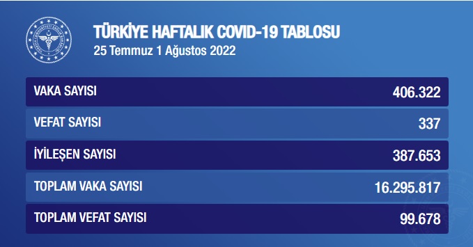 Sağlık Bakanlığı tarafından 25 Temmuz-1 Ağustos 2022 tarihleri arası, Türkiye Haftalık Koronavirüs COVİD19 Tablosunun son hali paylaşıldı.