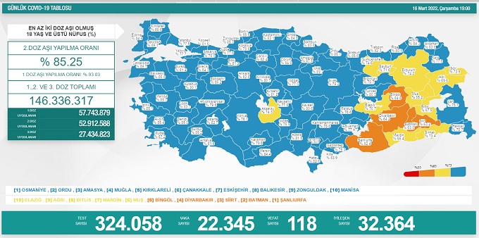Sağlık Bakanlığı tarafından 16 Mart 2022 tarihli, Türkiye Günlük Koronavirüs COVİD19 Tablosunun son hali paylaşıldı.