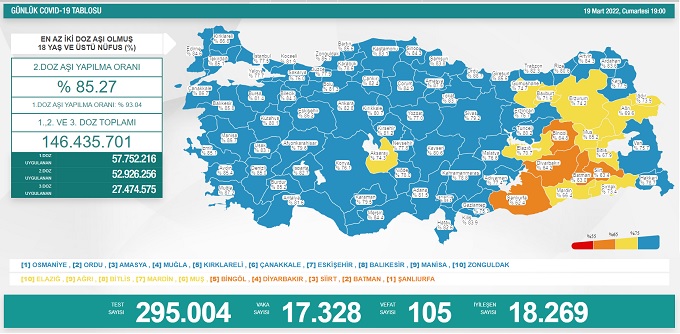 Sağlık Bakanlığı tarafından 19 Mart 2022 tarihli, Türkiye Günlük Koronavirüs COVİD19 Tablosunun son hali paylaşıldı.
