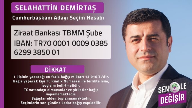 Selahattin Demirtaş Cumhurbaşkanlığı seçim kampanyası banka ve hesap numarası; Ziraat Bankası TBMM Şube IBAN: TR70 0001 0009 0385 6299 3850 01