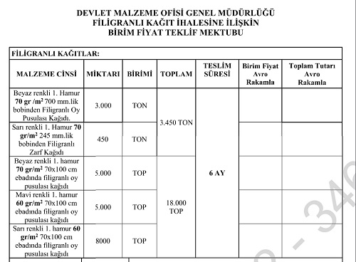 Devlet Malzeme Ofisi; T.C. Yüksek Seçim Kurulu Başkanlığı ihtiyacı "2 Kısım 2 Kalem Oluklu Mukavva Oy Verme Kabini" 23 Mart'ta “5 kalem Filigranlı Oy Pusulası ve Zarfı Kağıdı” 1 Nisan 2022'de ihaleye çıktı.