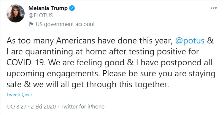 Eşinin Covid_19 testi pozitif çıkan Melania Trump tweet attı; "Bu yıl çok sayıda Amerikalının yaptığı gibi, @potus& COVID-19 testi yaptık. Test pozitif çıktı. Evde karantinadayız. İyi hissediyoruz ve yaklaşan tüm görüşmelerimi erteledim. Lütfen güvende olduğunuzdan emin olun ve bunu hep birlikte atlatacağız." dedi.