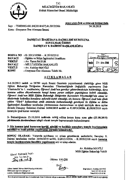 Temyiz dilekçesi mahkeme tarafından henüz tarafımıza tebliğ edilmemiş olmakla beraber Milli Eğitim Bakanlığı’na Anayasa ve yasalarımızda yer alan hükümler doğrultusunda Danıştay kararını uygulaması gerektiğini bir kez daha hatırlatmak istiyoruz.