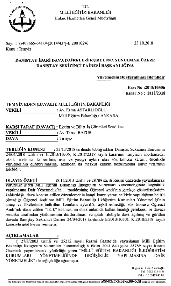 "Milli Eğitim Bakanlığı, Eğitim-İş’in açtığı dava sonucu Danıştay’ın aldığı ‘Andımız’ kararını yürütmeyi durdurma istemli temyiz ettiği bilgisi sendikamıza ulaşmıştır.