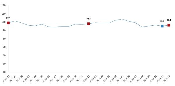 Ekonomik güven endeksi Kasım ayında 95,3 iken, Aralık ayında %1,1 oranında artarak 96,4 değerini aldı.