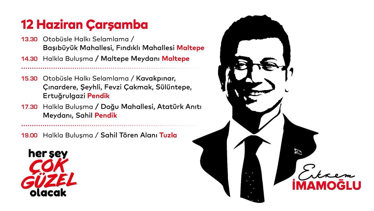 İBB'nin seçilmiş Başkanı Ekrem İmamoğlu, 12 Haziran Çarşamba günü İstanbul'un Maltepe, Pendik ve Tuzla ilçelerinde vatandaşlarla buluşacak.