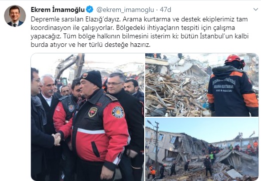 İmamoğlu deprem bölgesini ziyaretini sosyal medya hesabından paylaştı. İmamoğlu paylaşımında "Depremle sarsılan Elazığ’dayız. Arama kurtarma ve destek ekiplerimiz tam koordinasyon ile çalışıyorlar. Bölgedeki ihtiyaçların tespiti için çalışma yapacağız. Tüm bölge halkının bilmesini isterim ki; bütün İstanbul’un kalbi burda atıyor ve her türlü desteğe hazırız" ifadelerini kullandı.