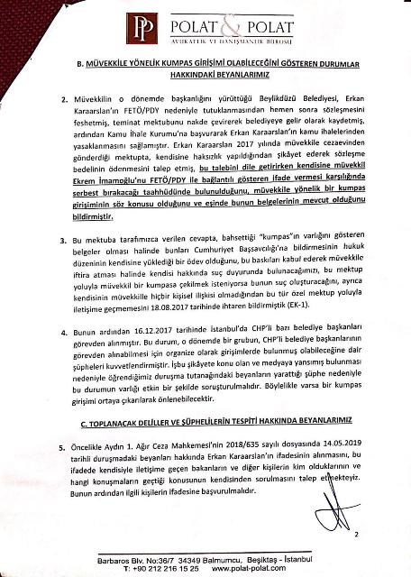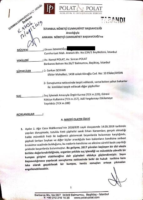 İstanbul Büyükşehir Belediyesi’nin (İBB) seçilmiş Başkanı Ekrem İmamoğlu’nun avukatı Kemal Polat, Çağlayan’daki İstanbul Adalet Sarayı’na gelerek, müvekkili hakkında kamuoyuna yansıyan iddialarla ilgili suç duyurusunda bulundu. Suç duyurusu öncesinde kameraların karşısına geçen Polat, şüpheliler hakkında ‘‘Suç işlemek amacıyla örgüt kurma’’, ‘‘Görevi kötüye kullanma’’ ve ‘‘Adil yargılamayı etkilemeye teşebbüs’’ suçlamalarını içeren suç duyurusu dilekçesini, Ankara Nöbetçi Cumhuriyet Başsavcılığı’na sunulmak üzere, İstanbul Nöbetçi Cumhuriyet Başsavcılığı’na sunacaklarını belirtti.