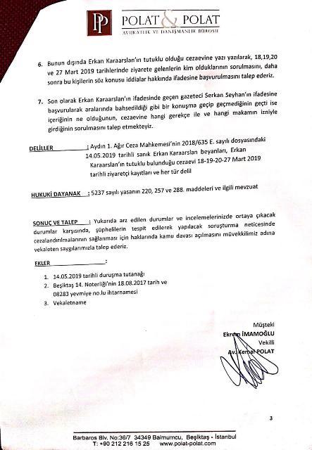 "Aydın 1. Ağır Ceza Mahkemesi’nde 14 Mayıs 2019’da görülen duruşmadaki beyanları hakkında Erkan Karaaslan’ın ifadesi alınsın. Kendisiyle iletişime geçen bakanların ve diğer kişilerin kim oldukları ve aralarında hangi konuşmaların geçtiği sorulsun. Karaaslan’ın tutuklu bulunduğu cezaevine yazı yazılarak, 18-19-20 ve 27 Mart 2019 tarihlerinde ziyaretine gelenler tespit edilsin. Tespit edilecek kişilerin söz konusu iddialar hakkında ifadelerine başvurulsun. Karaaslan’ın ifadesinde adı geçen gazeteci, şüpheli Serkan Seyhan’ın ifadesine başvurularak, aralarında iddia edildiği gibi bir konuşma geçip geçmediği sorulsun. Geçtiyse, içeriğinin ne olduğu, cezaevine hangi gerekçe ile ve hangi makamın izniyle gidildiği sorulsun.’’