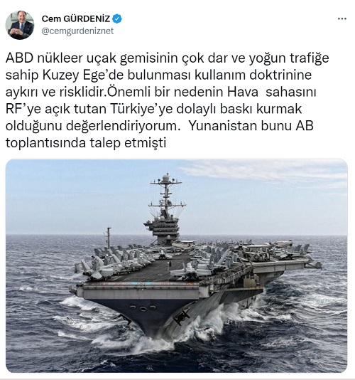 "ABD nükleer uçak gemisinin çok dar ve yoğun trafiğe sahip Kuzey Ege’de bulunması kullanım doktrinine aykırı ve risklidir. Önemli bir nedenin Hava sahasını RF’ye açık tutan Türkiye’ye dolaylı baskı kurmak olduğunu değerlendiriyorum. Yunanistan bunu AB toplantısında talep etmişti." dedi.