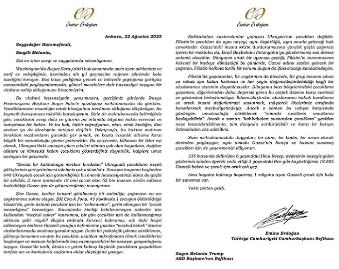 Emine Erdoğan, ABD Başkanı Donald Trump'ın eşi Melania Trump'a, Ukrayna'daki savaş için gösterdiği hassasiyeti Gazze'deki insani kriz için de göstermesi çağrısında bulunduğu bir mektup gönderdi.