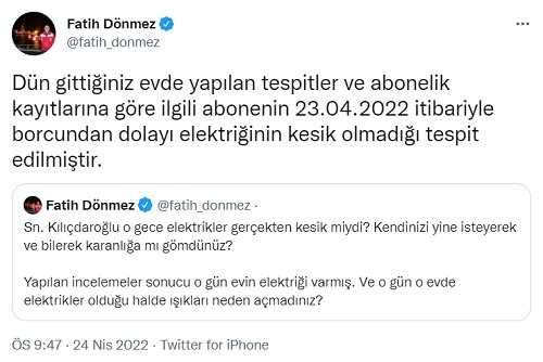 Enerji ve Tabii Kaynaklar Bakanı Fatih Dönmez'in Kılıçdaroğlu'nun elektriği kesik değildi iddiasıyla yaptığı paylaşımına büyük tepki: