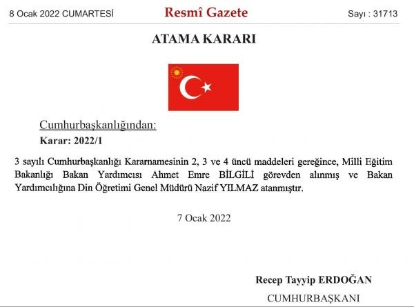 AKP Genel Başkanı ve Cumhurbaşkanı Erdoğan, Milli Eğitim Bakan Yardımcısı Ahmet Emre Bilgili'yi görevden aldı, yerine Din Öğretimi Genel Müdürü Nazif Yılmaz'ı atadı.