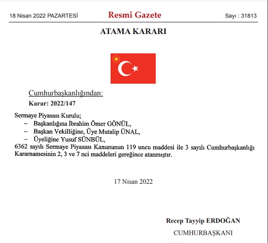 Atama Kararında Sermaye Piyasası Kurulunda Başkanlığa İbrahim Ömer Gönül, Başkanvekilliğine, üye Mutalp Ünal, Üyeliğine ise Yusuf Sünbül 6362 sayılı sermaye piyasası kanunun 119 uncu maddedi ile 3 sayılı Cumhurbaşkanlığı kararnamesinin 2, 3 ve 7nci maddeleri gereğince atanmıştır. denildi.