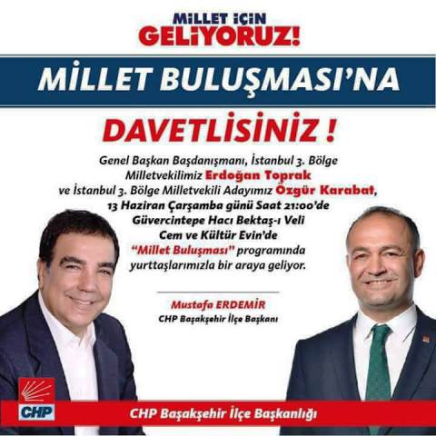CHP Genel Başkan Danışmanı, İstanbul 3. Bölge Milletvekili adayı Erdoğan Toprak ve 3. Bölge İstanbul Milletvekili adayı Özgür Karabat, Başakşehir İlçe Başkanlığı tarafından düzenlenen 'Millet Buluşması' programına katılacak.