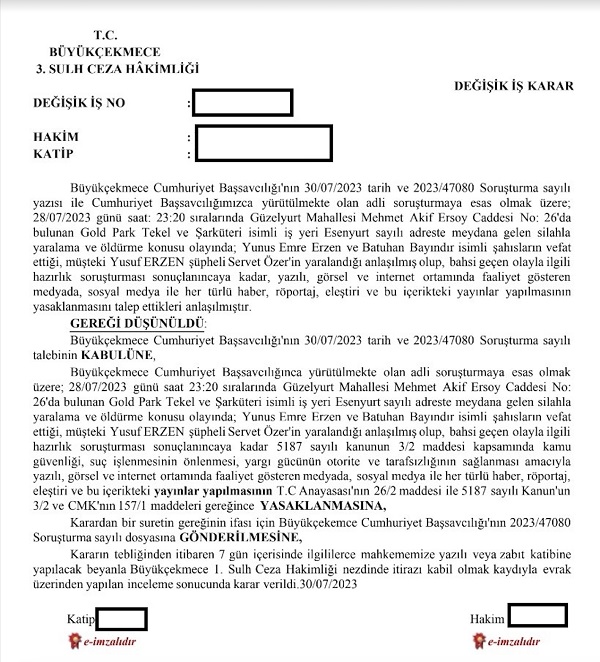 İstanbul Esenyurt'ta bir tekel bayisinde iki kişinin hayatını kaybettiği silahlı saldırıya ilişkin 'yayın yasağı' getirildi.