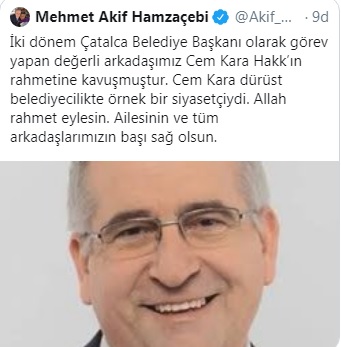 CHP İstanbul Milletvekili Mehmet Akif Hamzaçebi eski Çatalca Belediye Başkanı Cem Kara'nın yaşamını yitirdiğini duyurdu.