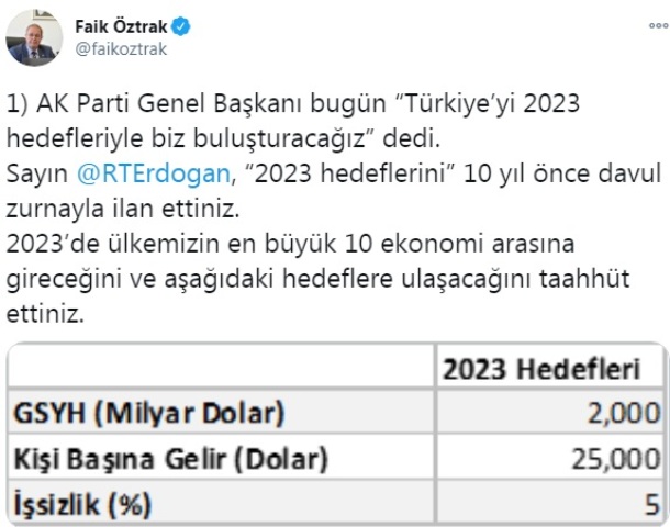7. Olağan Düzce, Çorum, Amasya, Bartın ve Karabük İl Kongrelerine Vahdettin Köşkü'nden canlı bağlantıyla katılan AKP'li Cumhurbaşkanı Recep Tayyip Erdoğan, “Türkiye’yi 2023 hedefleriyle biz buluşturacağız” açıklamasında bulundu. Erdoğan'ın açıklamasının değerlendiren CHP Sözcüsü Faik Öztrak, Erdoğan'ın açıkladığı 2023 hedeflerini paylaşarak, "Bu 'performansla' gelecek üç yılda işsizliği 8,8 puan birden nasıl düşüreceksiniz" diye sordu.
