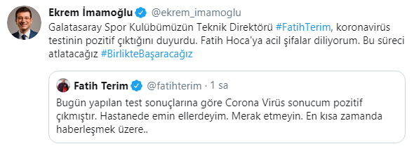 İBB Başkanı Ekrem İmamoğlu; "Galatasaray Spor Kulübümüzün Teknik Direktörü #FatihTerim, koronavirüs testinin pozitif çıktığını duyurdu. Fatih Hoca'ya acil şifalar diliyorum. Bu süreci atlatacağız #BirlikteBaşaracağız" dedi.