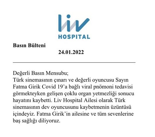Hastaneden yapılan çıklamada, "Türk sinemasının çınarı ve değerli oyuncusu Sayın Fatma Girik, COVID-19’a bağlı viral pnömoni tedavisi görmekteyken gelişen çoklu organ yetmezliği sonucu hayatını kaybetti. Liv Hospital ailesi olarak Türk sinemasının dev oyuncusunu kaybetmenin üzüntüsü içindeyiz. Fatma Girik’in ailesine ve tüm sevenlerine baş sağlığı diliyoruz" denildi.