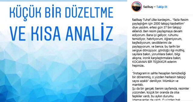 Dünyaca ünlü piyanist Fazıl Say, sosyal medya hesabı Instagram'daki takipçilerinin azaldığını, bunun da sanat eseri paylaşımlarından kaynaklı olduğunu belirtti.