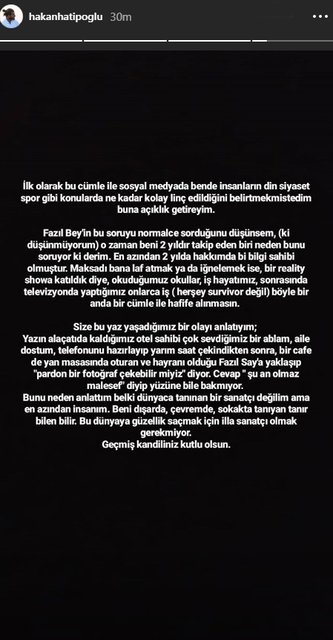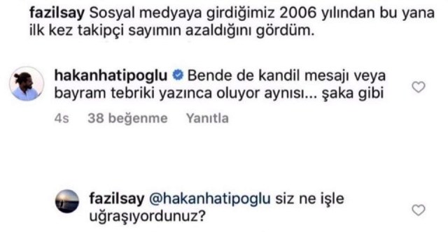 Fazıl Say, Hakan Hatipoğlu ile yaşadığı olay sonrası yaptığı açıklamada "Ben 5 yıldır İnstagram kullanıyorum, binlerce kişiyi takip ediyorum, bunların içinde tanıdıklarım, bildiklerim de var, belli bir vesileyle eklemiş olduklarım da. Bırakın doğasında işlesin her şey" dedi. ...