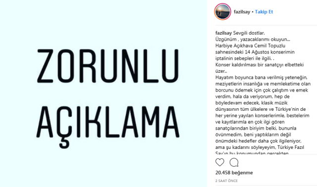 Fazıl Say’ın 14 Ağustos'ta Harbiye Açıkhava Cemil Topuzlu Sahnesi'nde yapılacak konseri iptal edildi. Sanatçı, konuyla ilgili sosyal medya hesabı İnstagram üzerinden bir açıklama yaptı. Say, yaptığı açıklamada "Kitabımda da çok yazdım, yıllardır tekrarladım, bu halk barışmalıdır, ötekileşmeler olmamalıdır, kültürler kaynaşmalıdır, doğu ve batı kültürleri buluşmalıdır, buna emek verilmelidir. Bir insanı anlamadan, önyargılarla hüküm verilmesine karşıyım. Yılda 120 konser veren bir insan emin olun “1” konseri olamıyor diye üzülmez, 119 konser olunca ne değişiyor ki, tam tersi sevinirim, ama sebebinin içeriği, bu olunca, haliyle üzülüyorum, memleketim adına üzülüyorum" dedi.