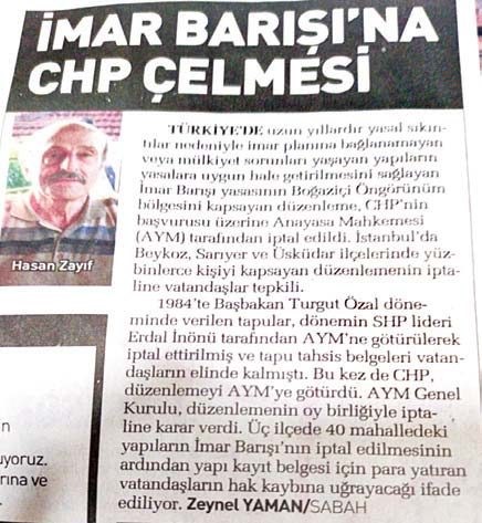 Yandaşların irilerinden birinde dün şöyle bir haber vardı; İmar barışına CHP çelmesi.