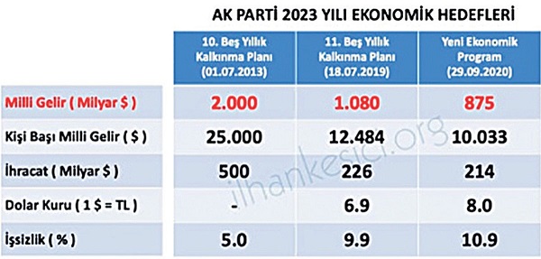 Örneğin 2013’de açıklanan 5 yıllık planda 2023 yılında kişi başı milli gelirin 25 bin dolar olması hedef seçilmiş.