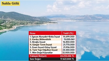 Salda Millet Bahçesi ihalesi tuhaf bir telaşla yapıldı. Geçen çarşamba TOKİ'nin İstanbul şubesindeki 7 isteklinin katıldığını sonra AA açıkladı. Yaklaşık maliyet ile ihaleye verilen teklif ve indirim oranlarına ulaştık.