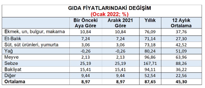Yıllık ortalamalara göre ekmek, un, bulgur, makarna fiyatları yüzde 37,8, et ve balık fiyatları yüzde 27,3, süt, süt ürünleri ve yumurta fiyatları yüzde 42,5, yağ fiyatları yüzde 51,1, meyve fiyatları yüzde 64, sebze fiyatları yüzde 88,3, bakliyat fiyatları yüzde 36,2, diğer gıda maddelerinin fiyatları da yüzde 22,6 oranında artış kaydetti.