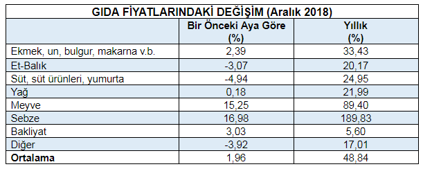 Türkiye ekonomisindeki krizin gıda fiyatları üzerindeki olumsuz etkisi devam ediyor. Gıda fiyatlarında aralık ayında yüzde 1,96 oranında artış yaşandı. 2018 yılında gıda harcamalarındaki toplam artış ise yüzde 48,84 olarak hesaplandı.