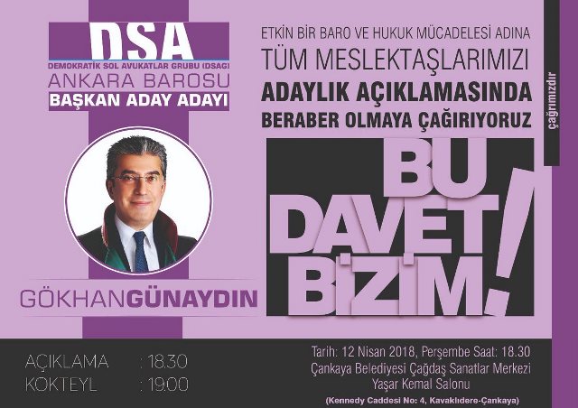 Gökhan Günaydın,12 Nisan 2018 Perşembe günü saat:18,30'da Çankaya Belediyesi Çağdaş Sanatlar MerkeziYaşar Kemal Salonunda Ankara Baro başkan adaylığını açıklayacak. Açıklama 19.00'da kokteyl ile devam edecek...