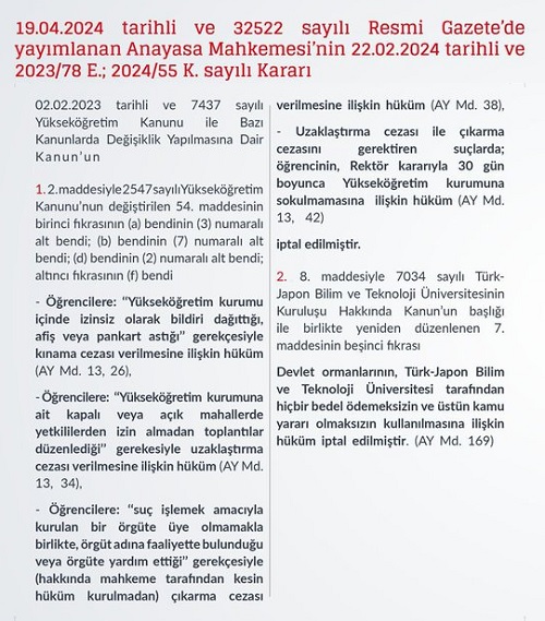 "Başvurumuz üzerine Anayasa Mah; üniversitelerde izin almadan pankart astığı, toplantılar düzenlediği, örgüt faaliyetinde bulunduğu (mahkeme kararı olmaksızın) gerekçesiyle öğrencilere çıkarma cezası verilmesine ilişkin YÖK Kanunu hükümlerini iptal etmiştir.