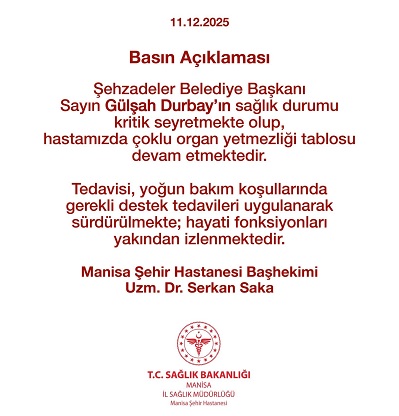 "Şehzadeler Belediyesi Başkanı Sayın Gülşah Durbay'ın sağlık durumu kritik seyretmekte olup, hastamızda çoklu organ yetmezliğitabloso devam etmektedir.