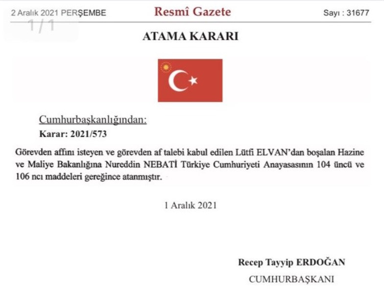 Buna göre, görevden affını isteyen ve talebi kabul edilen Lütfi Elvan'dan boşalan Hazine ve Maliye Bakanlığına Nureddin Nebati getirildi.