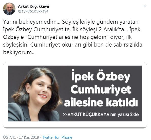 Küçükkaya, "Yarını bekleyemedim... Söyleşileriyle gündem yaratan İpek Özbey Cumhuriyet’te. İlk söyleşi 2 Aralık’ta... İpek Özbey’e “Cumhuriyet ailesine hoş geldin” diyor, ilk söyleşisini Cumhuriyet okurları gibi ben de sabırsızlıkla bekliyorum..." diye yazdı.