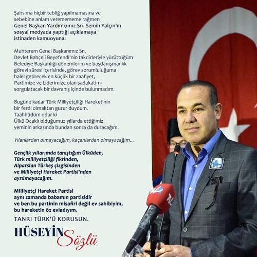 "Muhterem Genel Başkanımız Sn. Devlet Bahçeli Beyefendi'nin takdirleriyle yürüttüğüm Belediye Başkanlığı dönemlerim ve başdanışmanlık görevi süresi içerisinde, görev sorumluluğuma halel getirecek en küçük bir zaafiyet, Partimize ve Liderimize olan sadakatimi sorgulatacak bir