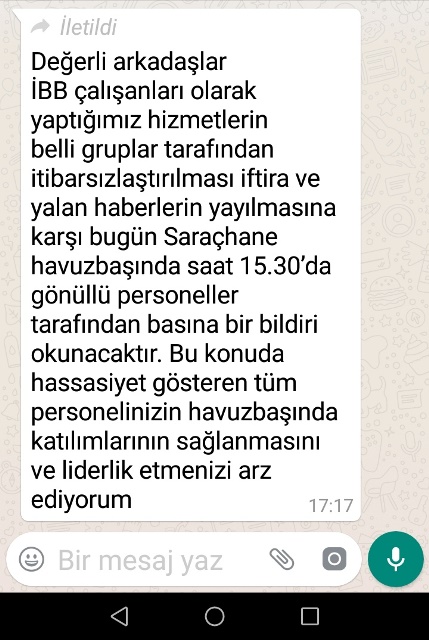 “Değerli arkadaşlar, İBB çalışanları olarak yaptığımız hizmetlerin belli gruplar tarafından itibarsızlaştırılması iftira ve yalan haberlerin yayılmasına karşı bugün Saraçhane havuzbaşında saat 15.30’da gönüllü personeller tarafından basına bir bildiri okunacaktır. Bu konuda hassasiyet gösteren tüm personelinizin katılımlarının sağlanmasını ve liderlik etmenizi arz ediyorum.”