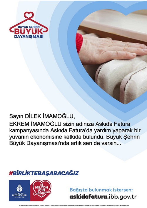 Ekrem İmamoğlu, eşi Dilek Kaya İmamoğlu adına Askıda Fatura’ya yardımda bulunarak, kampanyaya ilk desteği de kendisi verdi.