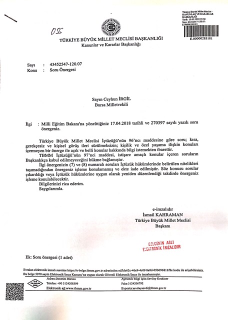 TBMM 26. Dönemi sona ererken bir önerge daha İçtüzük hükümlerine uygun olmadığından iade edildi. CHP Bursa Milletvekili Dr. Ceyhun İrgil tarafından Milli Eğitim Bakanı İsmet Yılmaz’a yöneltilen yazılı soru önergesinde iki soru sakıncalı bulundu. Sözleşmeli öğretmenlik alımı için mülakat yapacak komisyonların başkanlarına Cumhurbaşkanı listesi verildiği, yani torpil talimatı verildiği iddiasını içeren önergenin Meclis Başkanı İsmail Kahraman tarafından geri yollanmasına neden olan sorular şunlar: