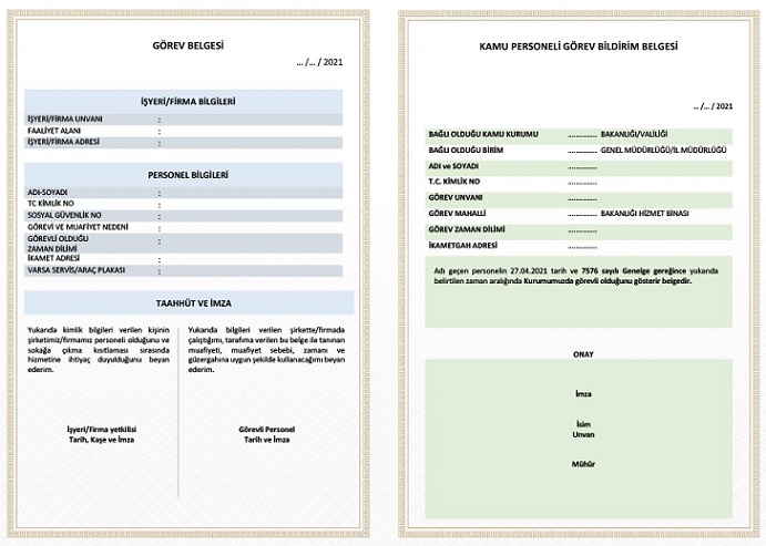 Başvuruda bulunan çalışana dair kimlik bilgilerinin yanı sıra sokağa çıkma kısıtlaması sırasında hangi amaçla işyerinde olması gerektiği, çalışma süresi/zaman dilimi, işyeri ve ikamet adresi, varsa kullanacağı servis ya da araç plaka bilgisinin de yer alacağı görev belgesinin çıktısı başvuruda bulunan kişi tarafından alınarak işyeri/firma yetkilisine imzalatılacak.