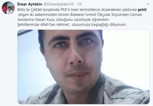 CHP Balıkesir Milletvekili Ensar Aytekin şehit askerlerden Uzman Jandarma Hasan Kuzu'nun Balıkesir Balıkesir İvrindi Okçular Köyünden olduğunu açıkladı. Aytekin; "Bitlis’te Çeltikli kırsalında PKK'lı hain teröristlerce düzenlenen saldırıda şehit düşen iki askerimizden birinin Balıkesir İvrindi Okçular Köyünden Uzman Jandarma Hasan Kuzu olduğunu üzüntüyle öğrendim. Şehitlerimize Allah'tan rahmet; ulusumuza başsağlığı diliyorum." dedi.