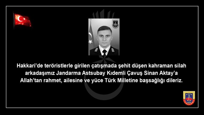 İçişleri Bakanlığı, Hakkari’nin Yüksekova ilçesi kırsalında 2 teröristin ölü ele geçirildiği operasyonda, Jandarma Astsubay Kıdemli Çavuş Sinan Aktay'ın şehit olduğunu açıkladı.