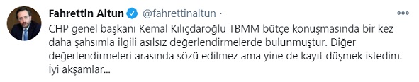 İletişim Başkanı Fahrettin Altun, Twitter hesabından yaptığı açıklamada, "CHP Genel Başkanı Kemal Kılıçdaroğlu, TBMM bütçe konuşmasında bir kez daha şahsımla ilgili asılsız değerlendirmelerde bulunmuştur. Diğer değerlendirmeleri arasında sözü edilmez ama yine de kayıt düşmek istedim" dedi.