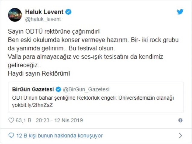 Ankara'da bulunan Orta Doğu Teknik Üniversitesi (ODTÜ) Rektörlüğü'nün bu yıl 33'üncüsü yapılması planlanan Uluslararası Bahar Şenliği'ni iptal etmesinin ardından çok sayıda sanatçı sosyal medya hesabından organizasyona destek mesajı paylaştı.